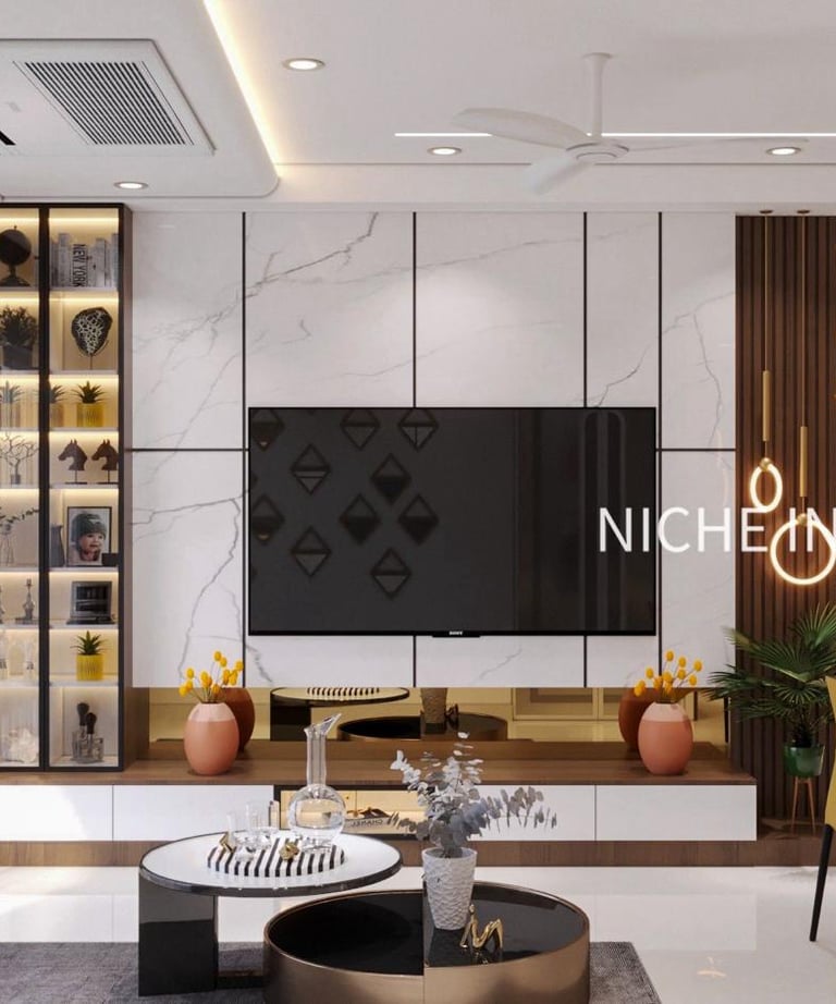This 3BHK apartment in Aurobindo Kohinoor Marvel showcases Niche Design Studio's signature approach: a harmonious blend of form and function, resulting in an elegant and comfortable living environment.